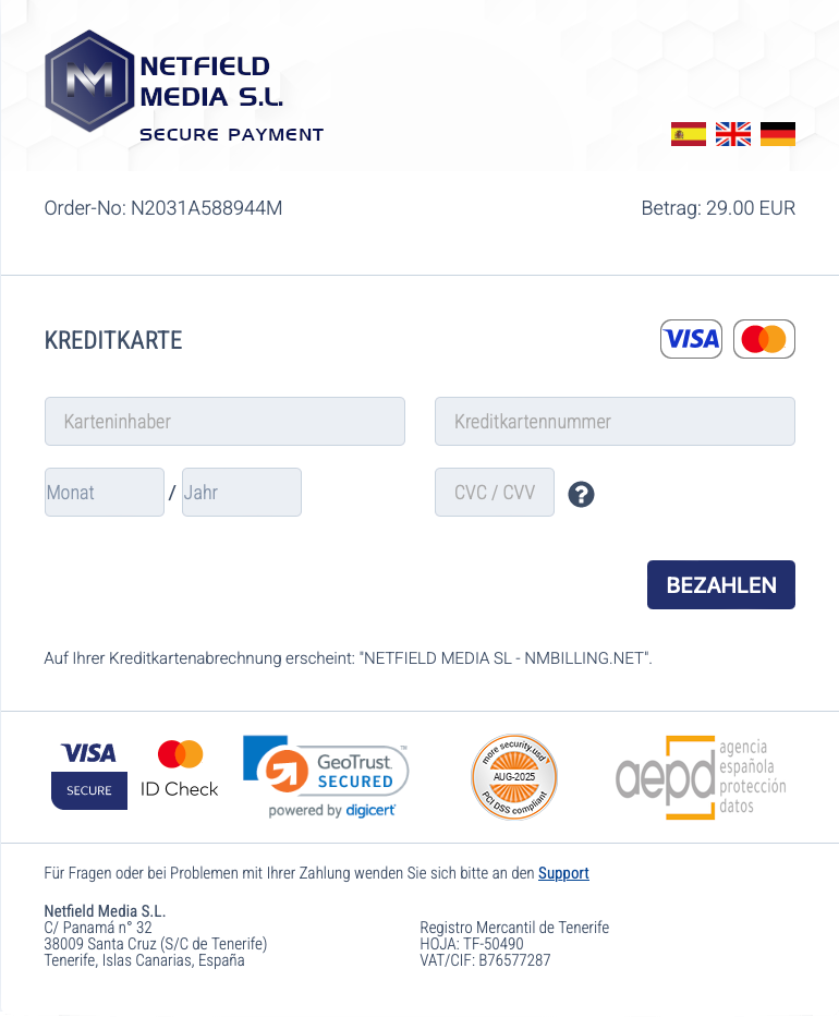 Ihre Kunden erhalten nun eine Übersicht unsere vielfältigen Zahlungsmöglichkeiten sowie weitere Informationen zu dem gebuchten Dienst. In unserem Beispiel entscheidet sich der Kunde für die Bezahlung per Kreditkarte.
