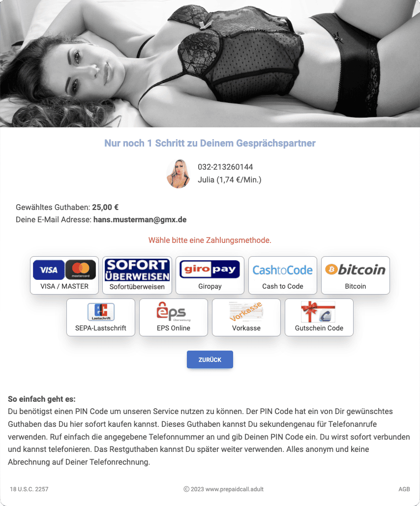 Nach Auswahl der passenden Beratungshotline wird dem Kunden die Rufnummer sowie die Kosten pro Minute angezeigt. Um ein Guthaben zu kaufen wird nur seine E-Mail Adresse benötigt. Nach Auswahl der gewünschten Bezahlmöglichkeit und anschließendem Kauf steht das Telefonguthaben sofort zur Verfügung.